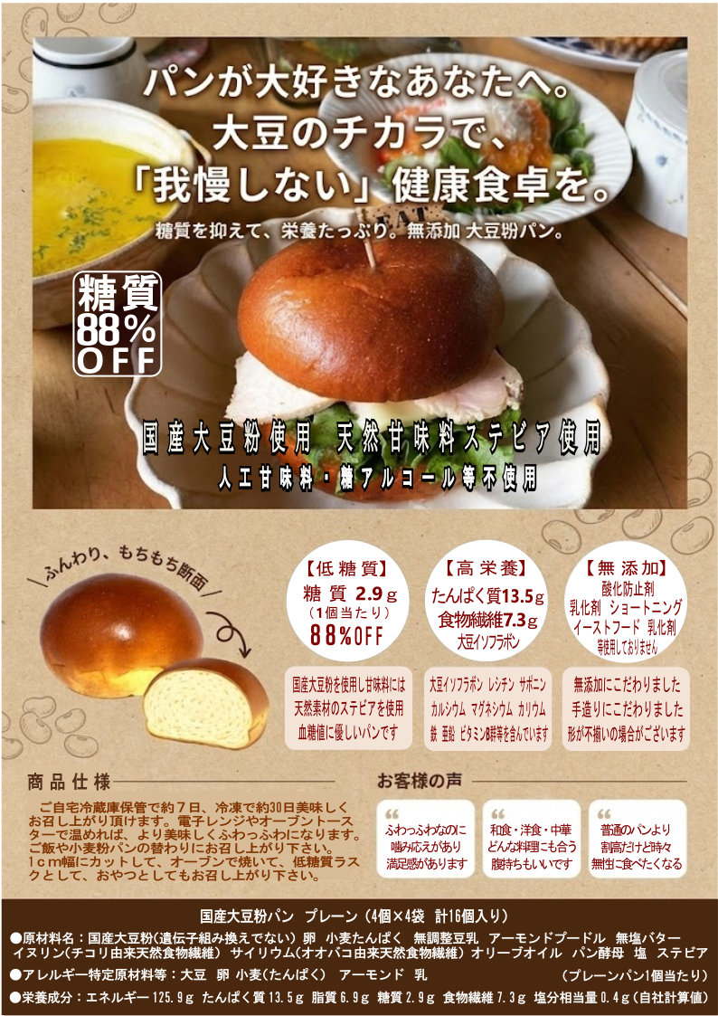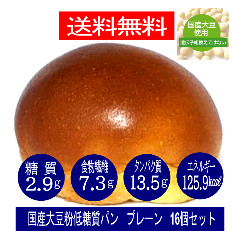 低糖質国産大豆粉パン プレーン16個セット 送料無料 (1個あたり) 糖質2.9g 重さ46g エネルギー125.9Kcal たんぱく質13.5g 食物繊維7.3g